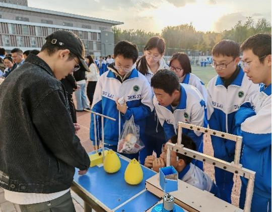 活动志愿者积极组织学生有序观看物理实验、讲解实验原理,引导学生观察实验现象,将抽象的物理知识转化为直观认知,并现场展示科技教具,通过趣味演示吸引大量师生围观,不少学生主动提问,志愿者耐心解答并鼓励其参与体验。