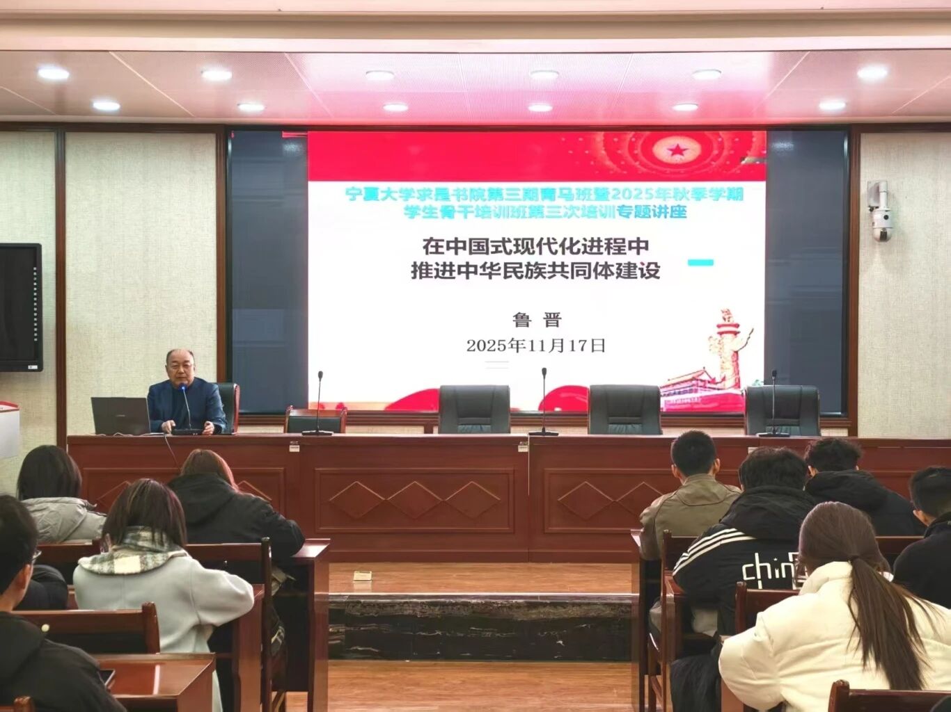 11月17日,宁夏大学求是书院第三期“青年马克思主义者培养工程”培训班暨2025年秋季学期团学骨干培训班第三次培训在怀远校区逸夫楼一楼报告厅顺利开展。本次培训以“在中国式现代化进程中推进中华民族共同体建设”为主题,由宁夏大学关心下一代工作委员会宣讲团成员鲁晋主讲,培训班全体学员及团委、学生会、研究生会全体成员参加。
