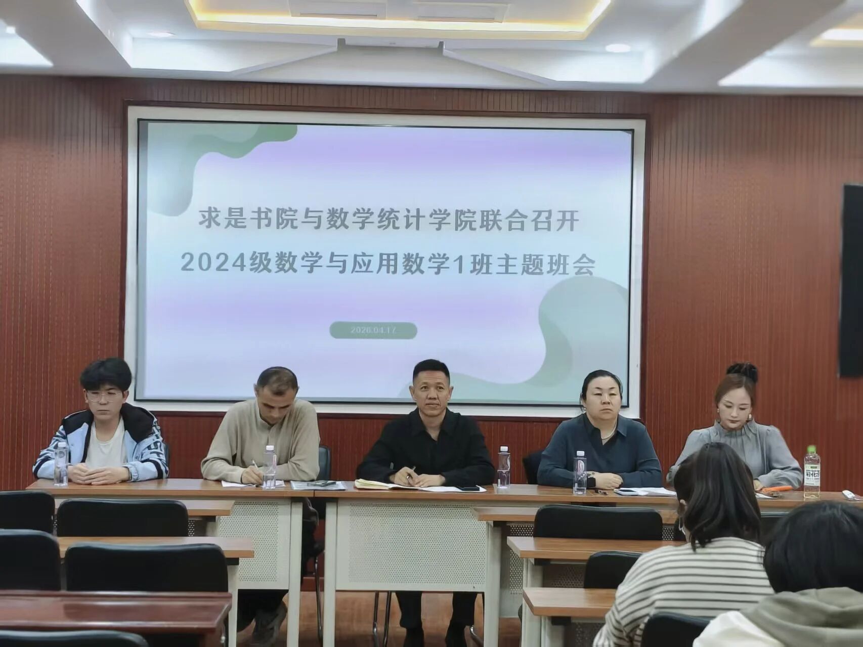 为进一步摆脱班级发展困境、强化班级学风建设,助力学生成长成才,求是书院联合数学统计学院于4月17日15时,在宁远楼213室召开主题班会。求是书院党委副书记马彦峰、数学统计学院副院长马婧瑛、班主任刘国军、辅导员刘璐出席班会,2024级学生助管金磊及2024级数学与应用数学1班全体同学参会,班会由辅导员刘璐主持。